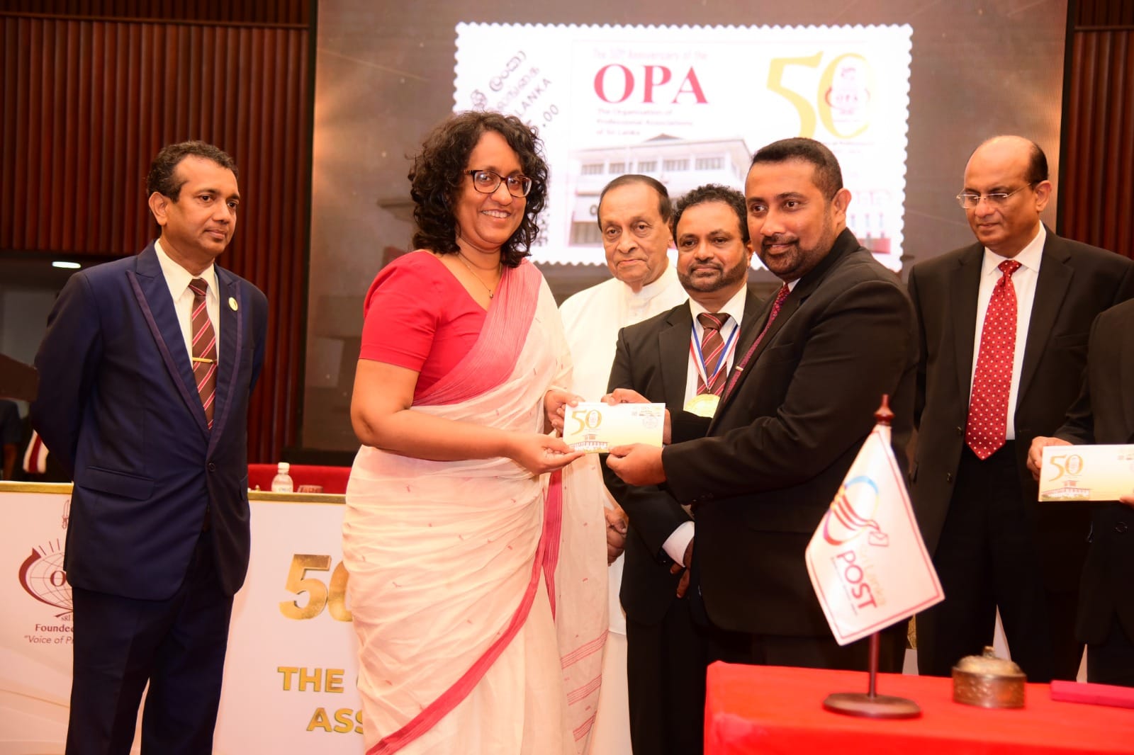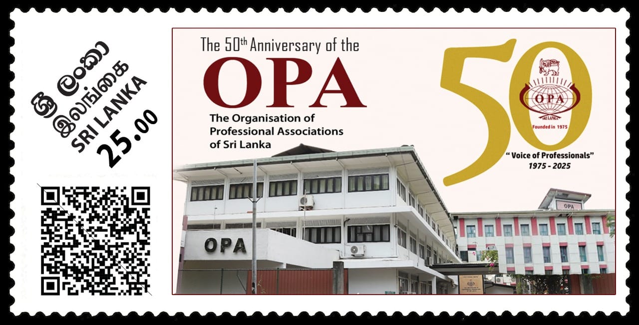 At the 50th anniversary celebrations of the Organisation of Professional Associations of Sri Lanka ( OPA ) on 29th May 2025 at the BMICH, the Postal Department issued a special Commemorative Stamp and a first day cover which was presented to the Chief Guest Dr. Harini Amarasuriya, Prime Minister of Sri Lanka, Justice Sobitha Rajakaruna, Former Speaker, Karu Jayasuriya and the OPA President, Mr. Sujeewa Lal Dahanayake by the Post Master General.