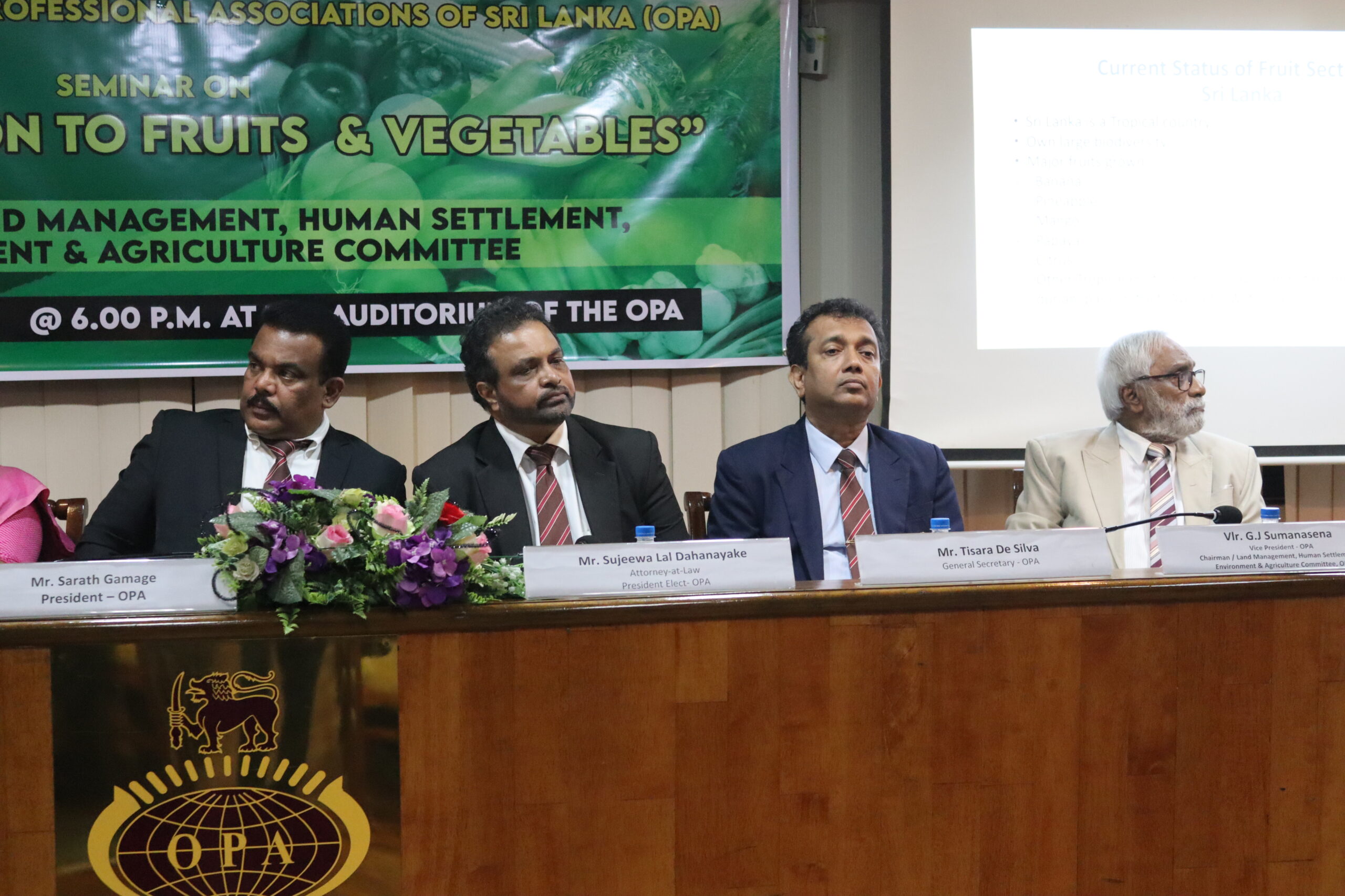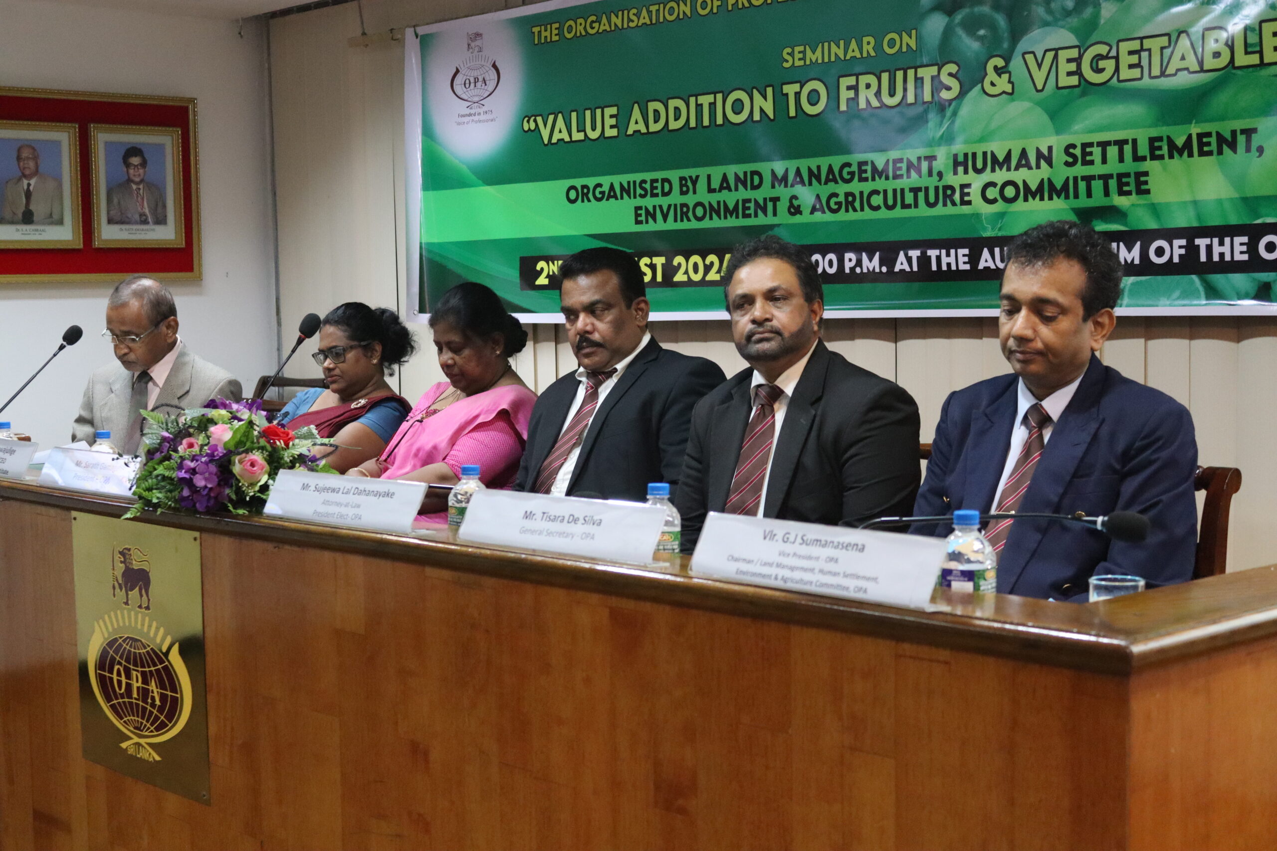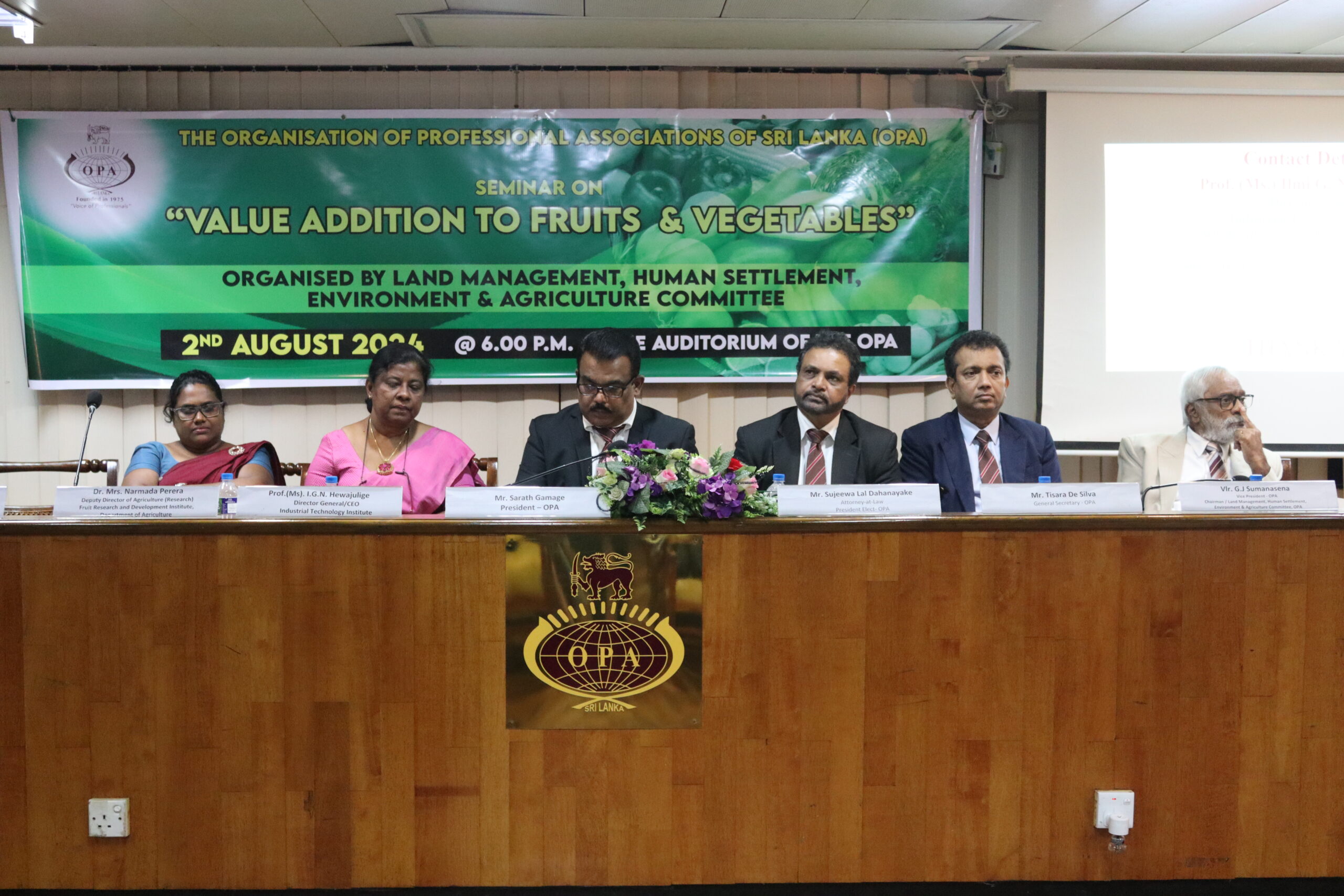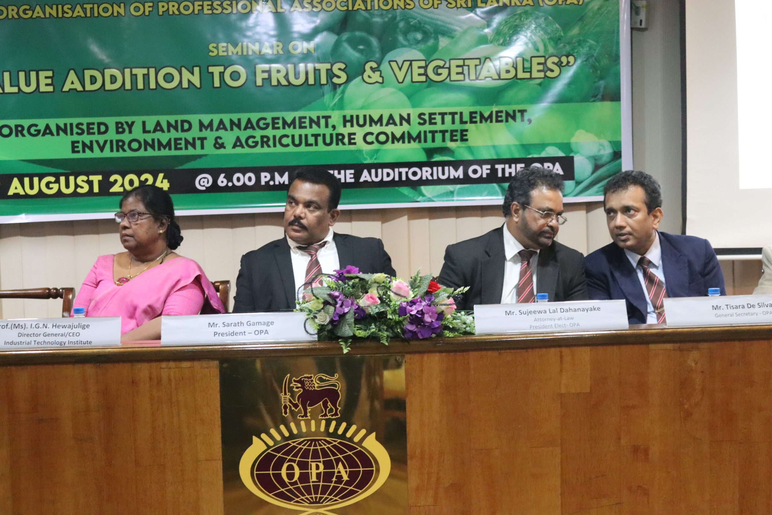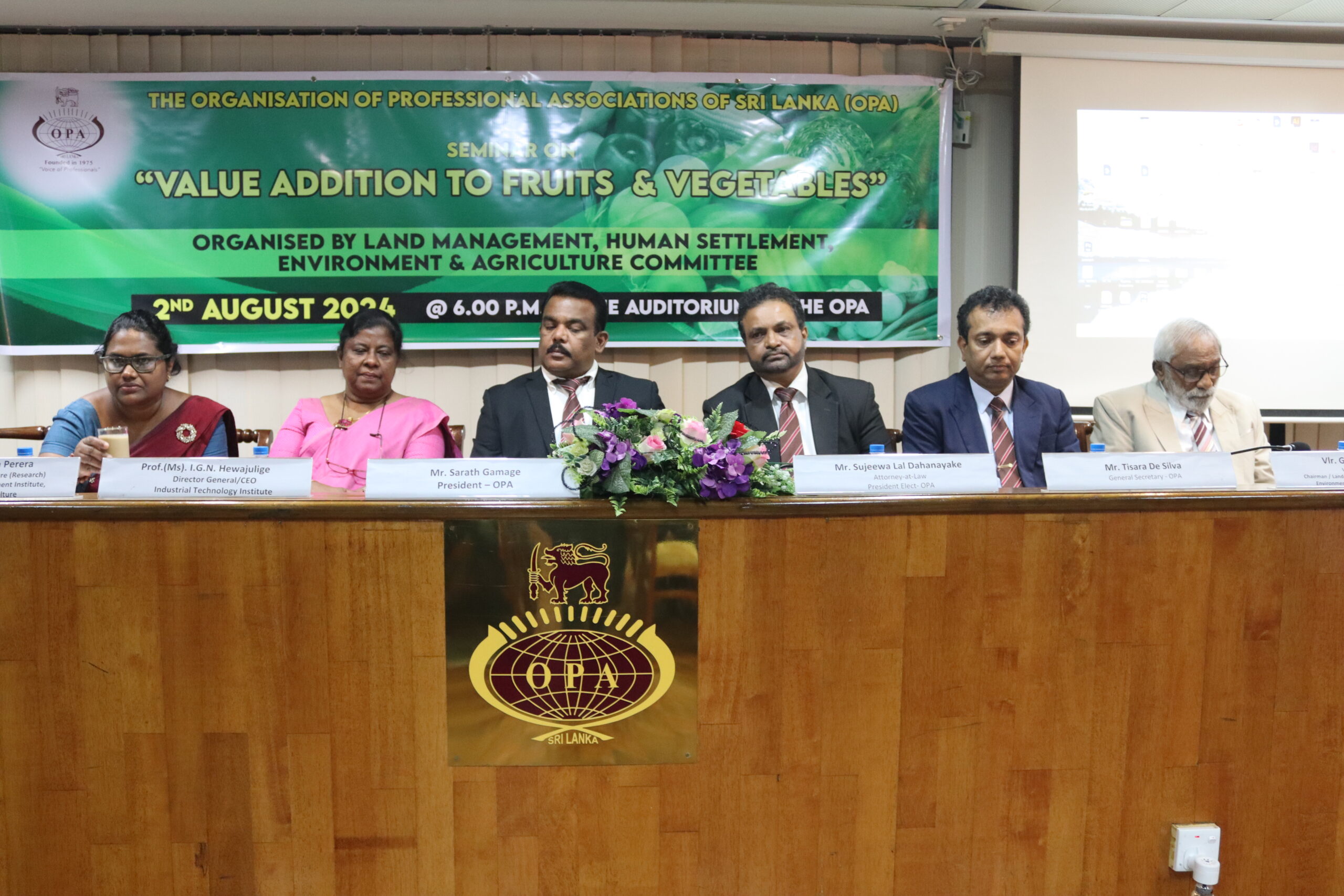 A seminar on “Value Addition to Fruits and Vegetables”, organized by the Land Management, Human Settlement, Environment and Agriculture Committee, was held at the OPA auditorium on the 2nd of August. The guest speakers were Prof. (Ms.) Ilmi Hewajulige, Director General and CEO, Industrial Technology Institue and Dr. (Mrs.) Narmada Perera, Deputy Director of Agriculture (Research), Fruit Research and Development Institute, Department of Agriculture. The event was moderated by Mr. Nelson de Silva, Former District Director, Ministry of Agriculture, and Senior Consultant, Open University of Sri Lanka.