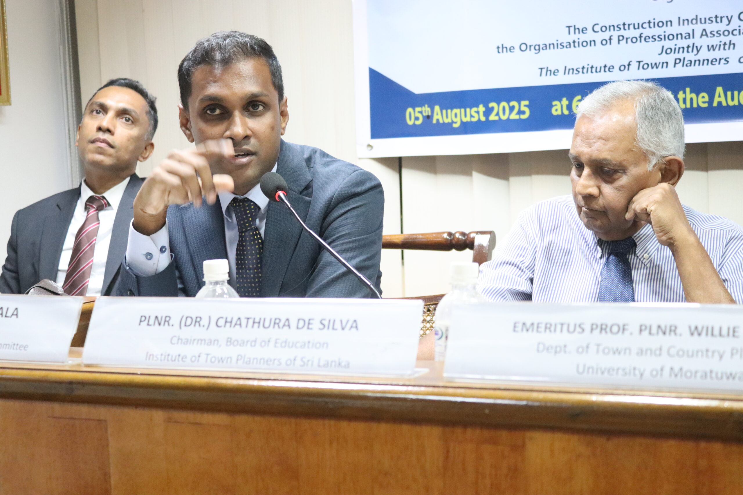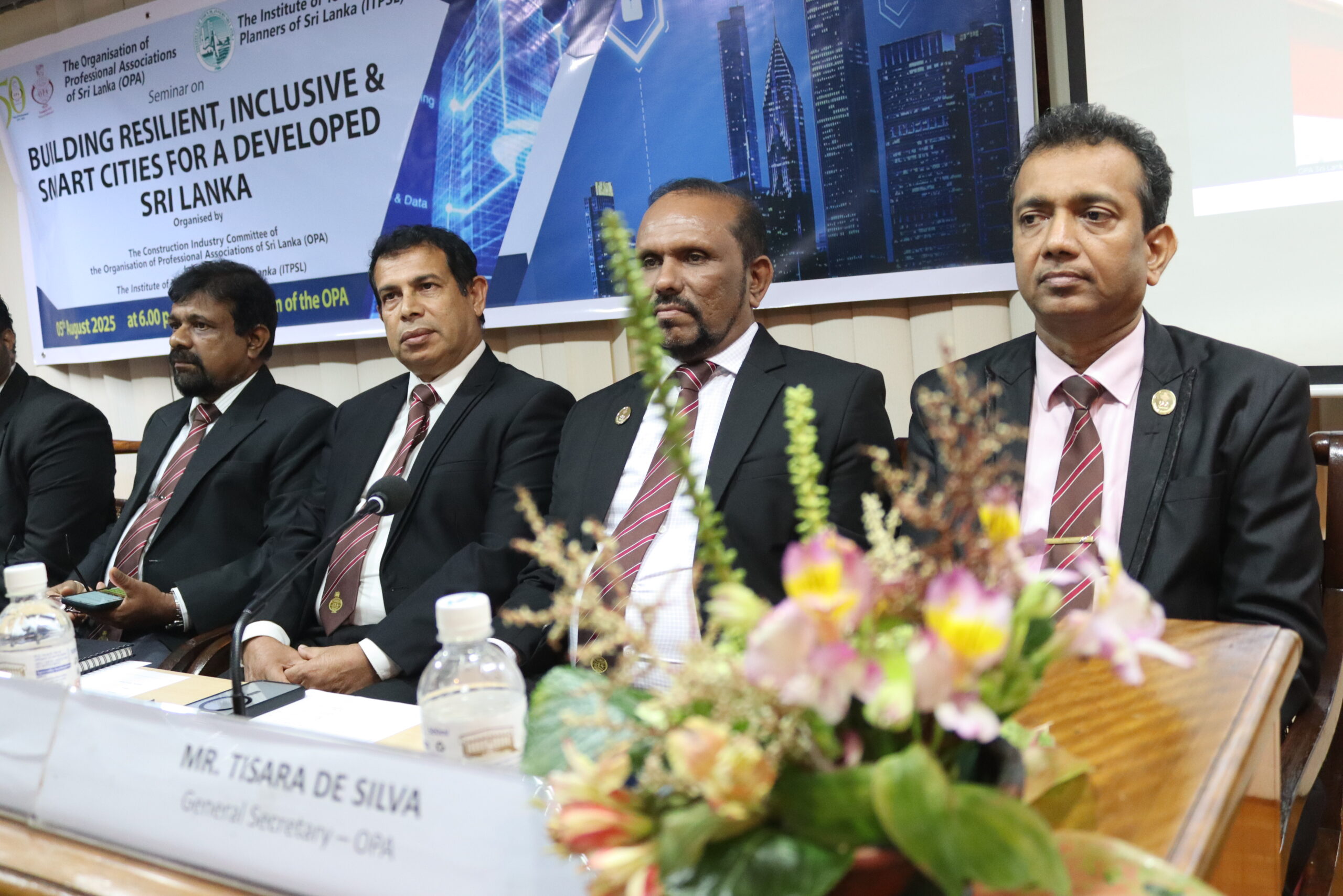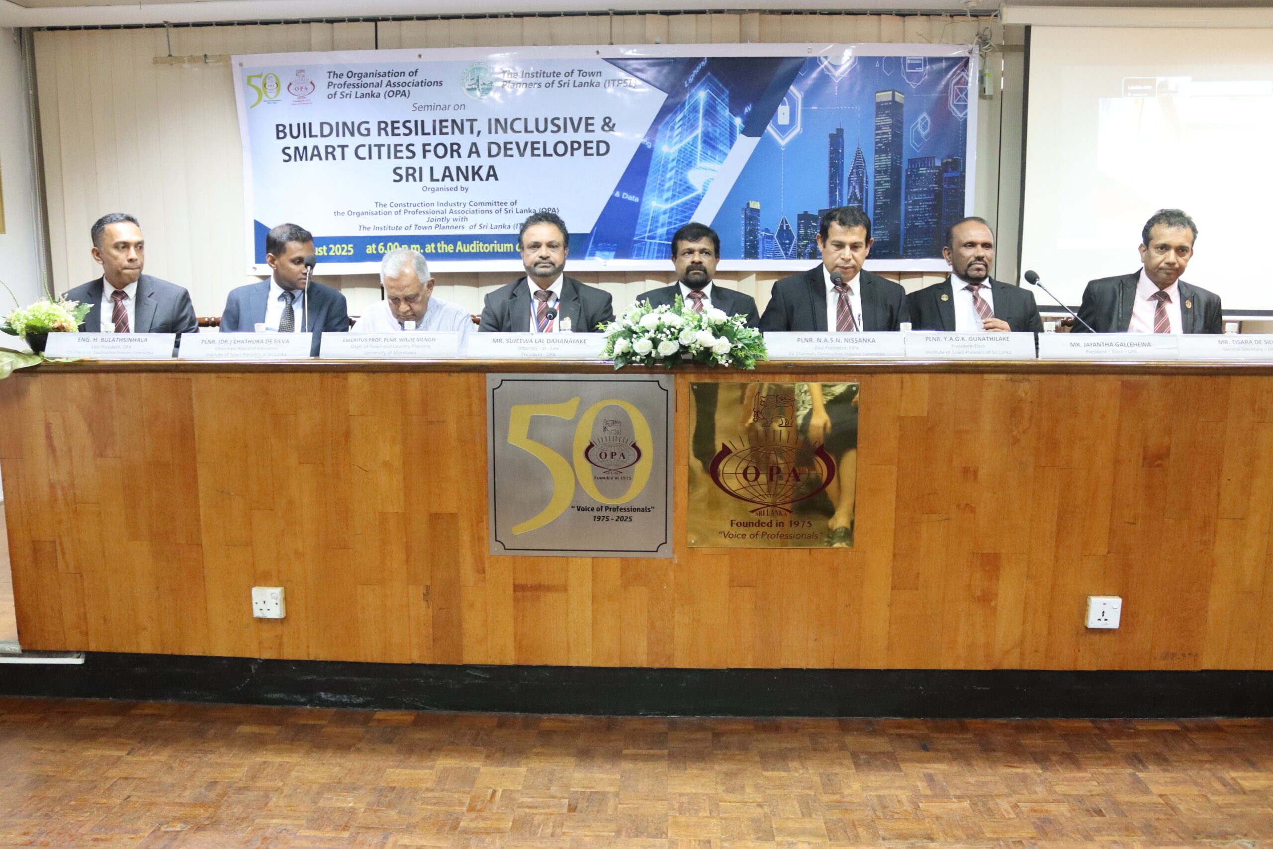 A seminar on “Building Resilient, Inclusive and Smart Cities for a Developed Sri Lanka” jointly organized by the Construction Industry Committee of the OPA and The Institute of Town Planners of Sri Lanka, was held on the 5th of August, 2025 at the OPA. Emeritus Prof. Plnr. Willie Mendis, Faculty of Architecture of the University of Moratuwa, Plnr. Y.A.G.K. Gunathilake, President-Elect, ITPSL, and Plnr. (Dr.) Chathura de Silva, Chairman, Board of Education, ITPSL, were the eminent guest speakers who participated at this event. The moderator was Plnr. Chathurika Liyanage.