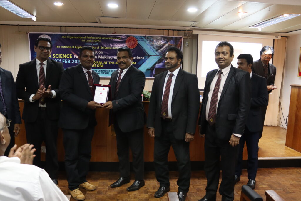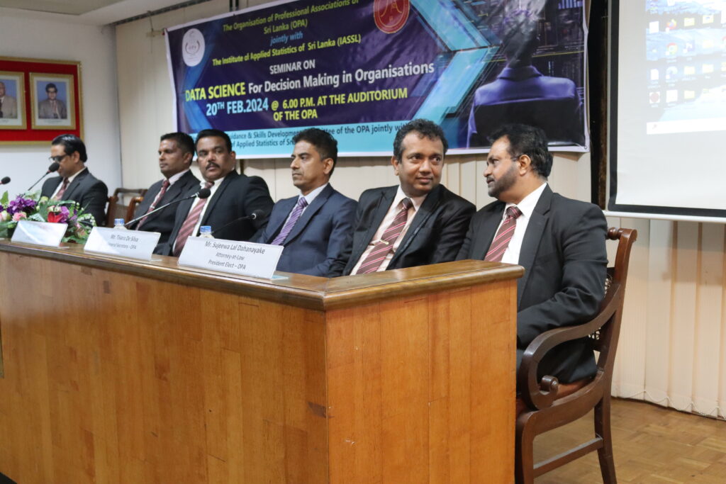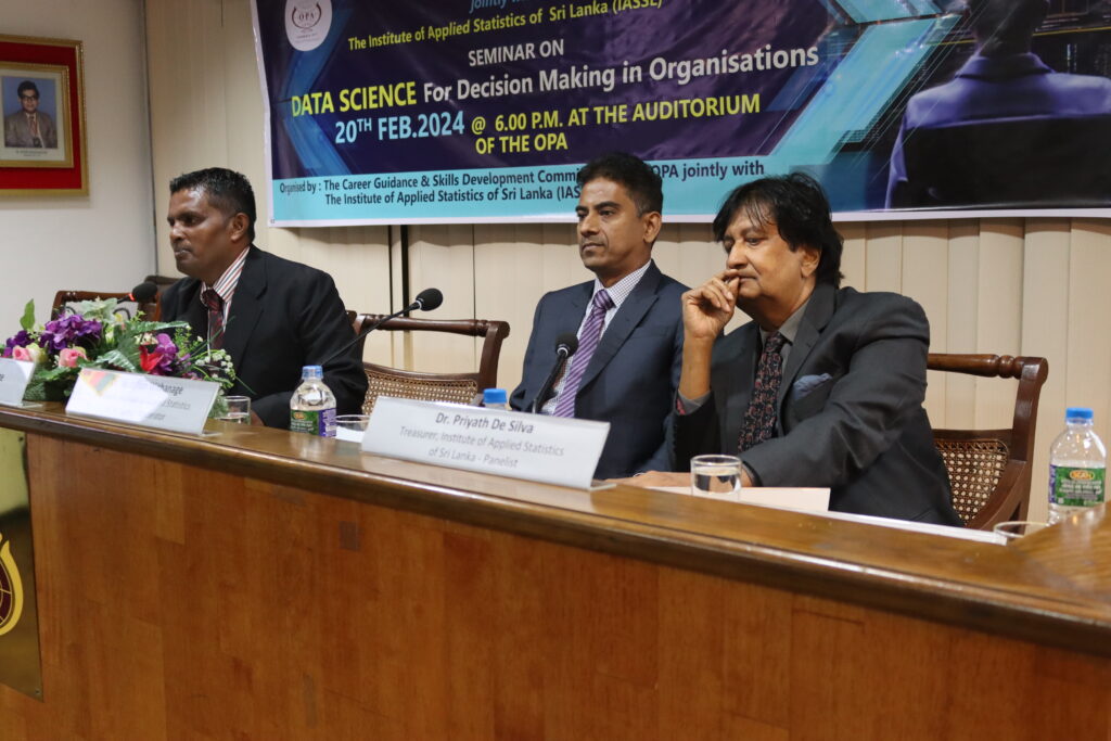 A seminar on “Data Science for Decision Making in Organisations” was jointly organized by the Career Guidance and Skills Development Committee of the OPA and the Institute of Applied Statistics of Sri Lanka (IASSL). The event, which took place on the 20th of February, 2024 at the OPA auditorium, featured Prof. Kapila Rathnayake, Professor of Mathematics and Statistics, as guest speaker. Dr. Priyath de Silva,Treasurer, IASSL, also participated as a panelist while the moderator was Dr. Niroshan Withanage,President, IASSL.