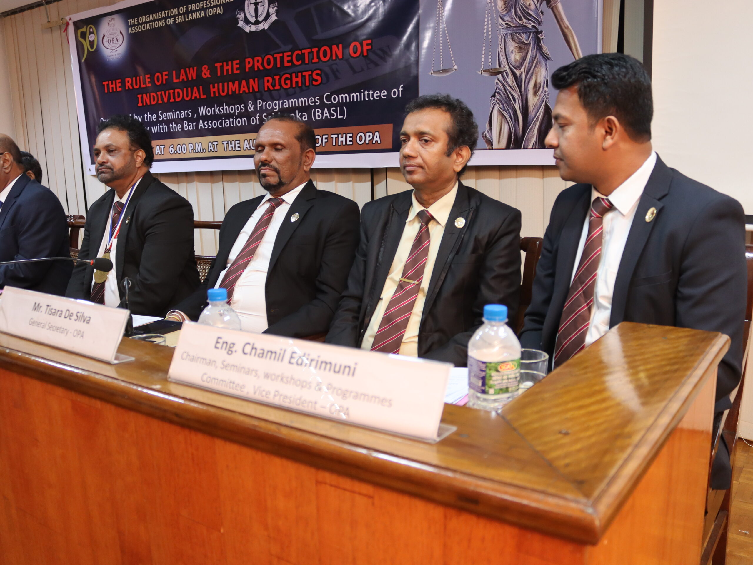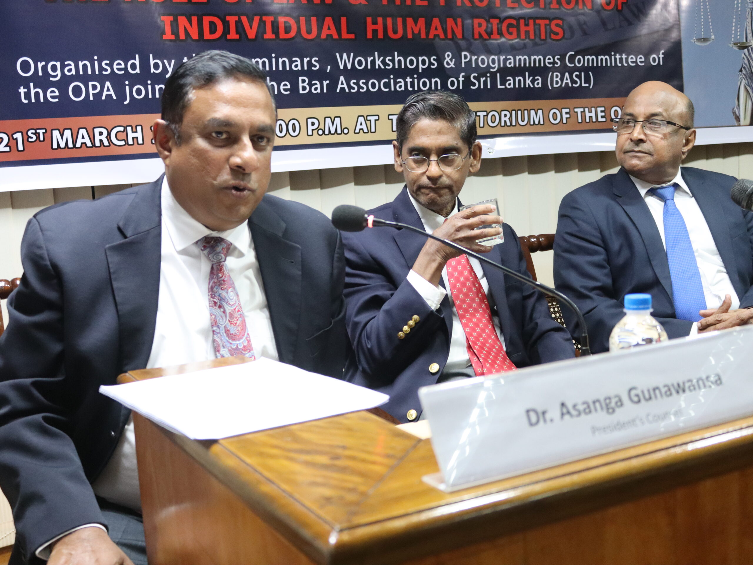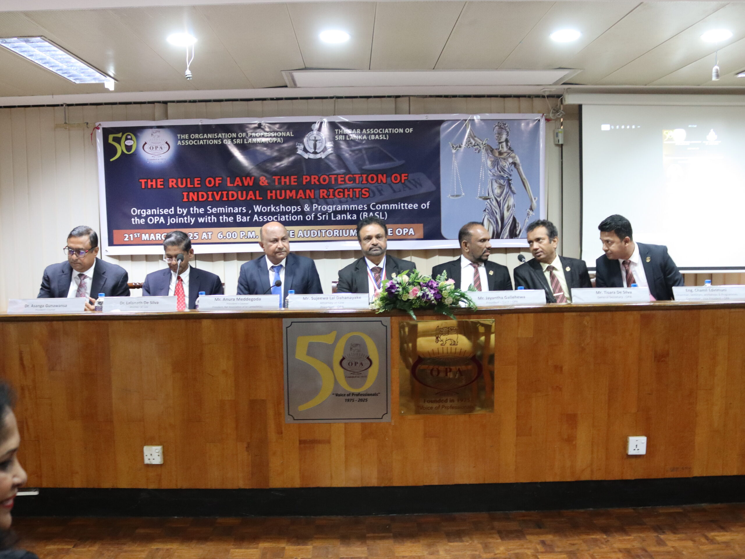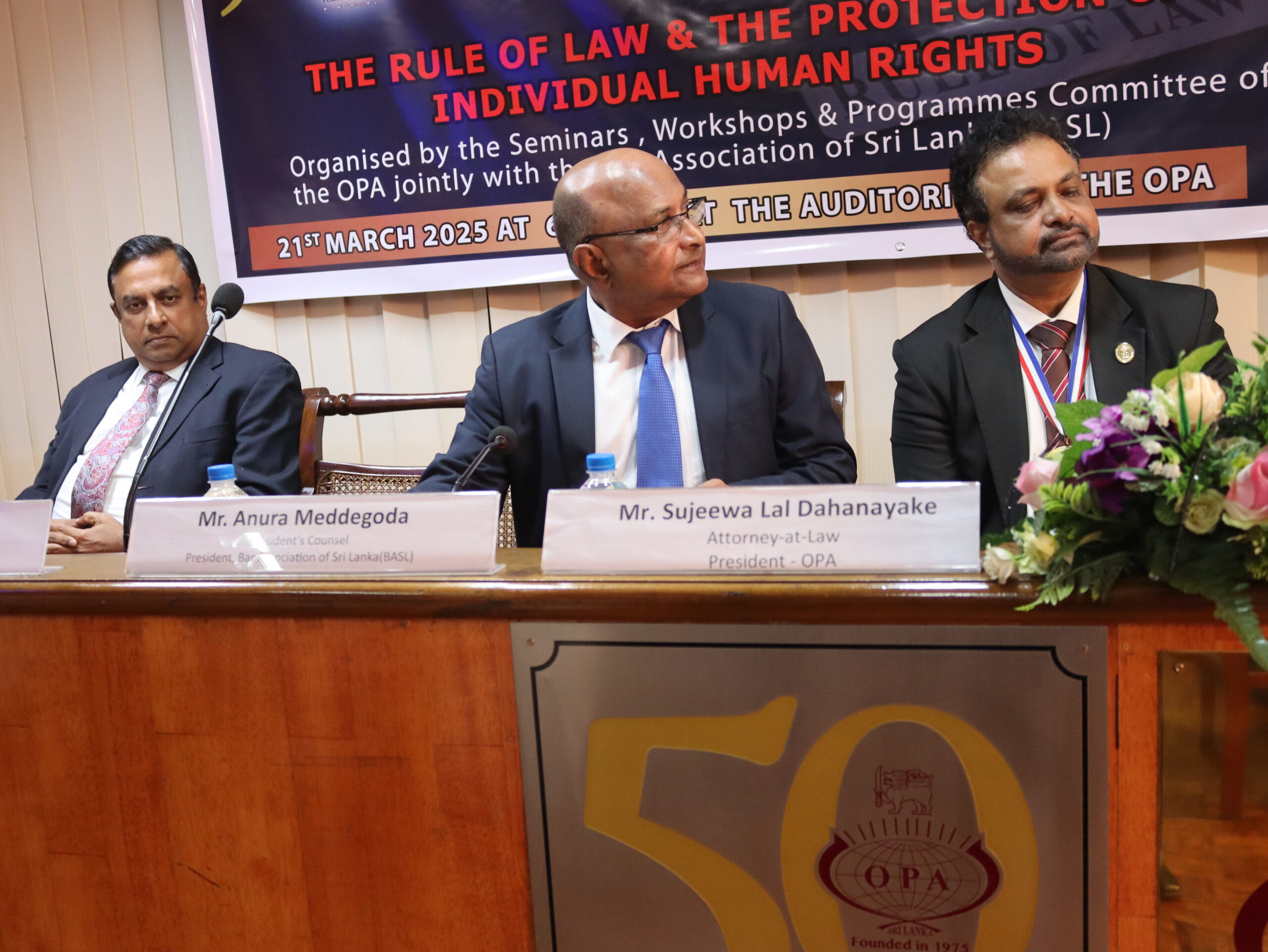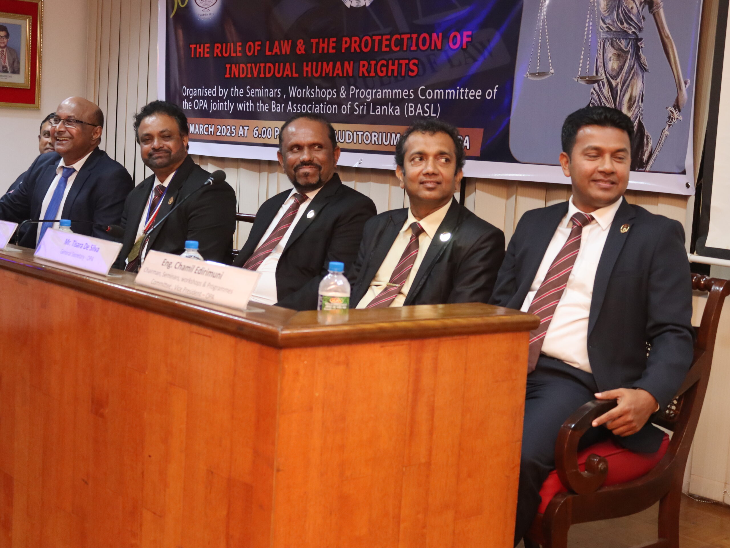 A seminar on “The Rule of Law and the Protection of Individual Human Rights”, organized jointly by the Seminars, Workshops and Programmes Committee of the OPA together with the Bar Association of Sri Lanka, was held at the OPA Auditorium on the 21st of March, 2025. Dr. Asanga Gunawansa, President’s Counsel and Dr. Lalanath De Silva, Attorney-at-Law were the expert speakers at this event, which concluded with an interactive Q & A session with the active participation of the audience.