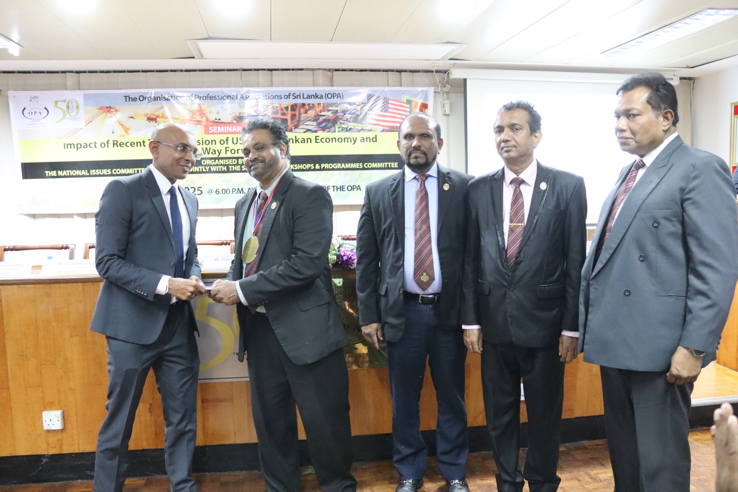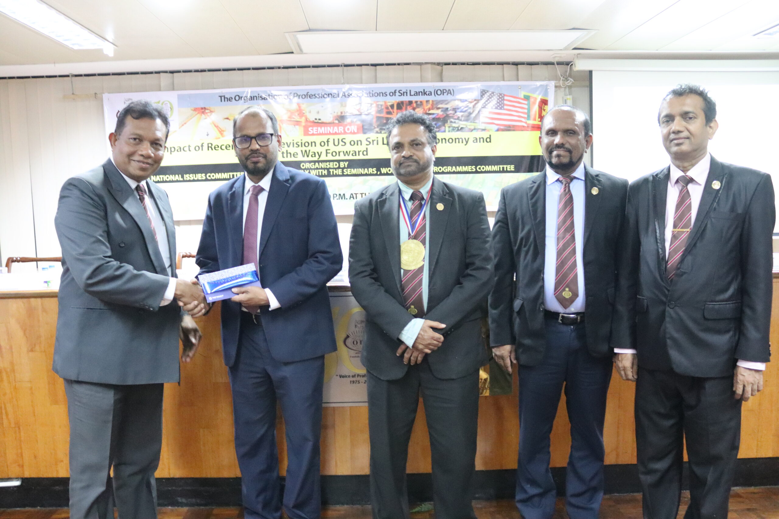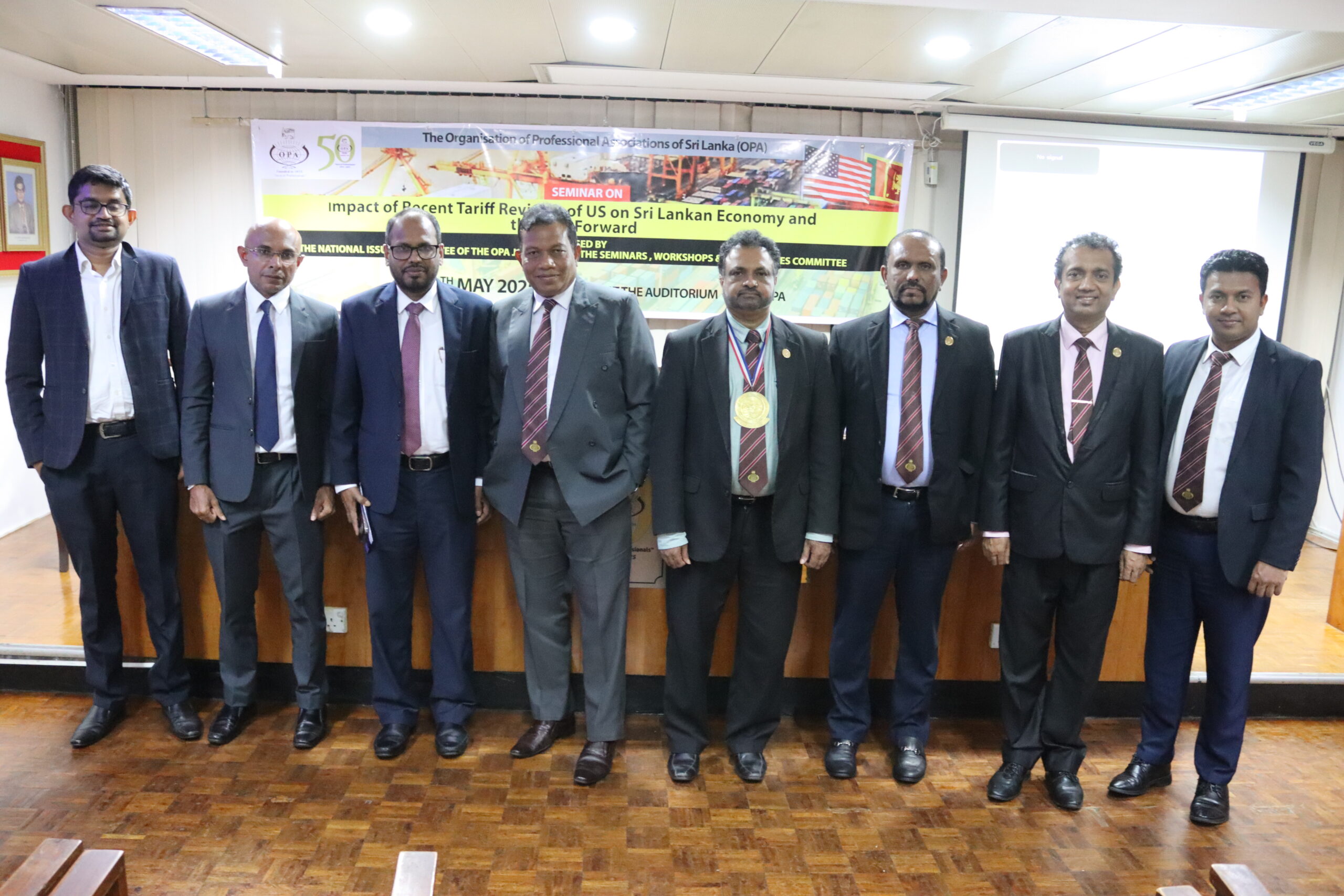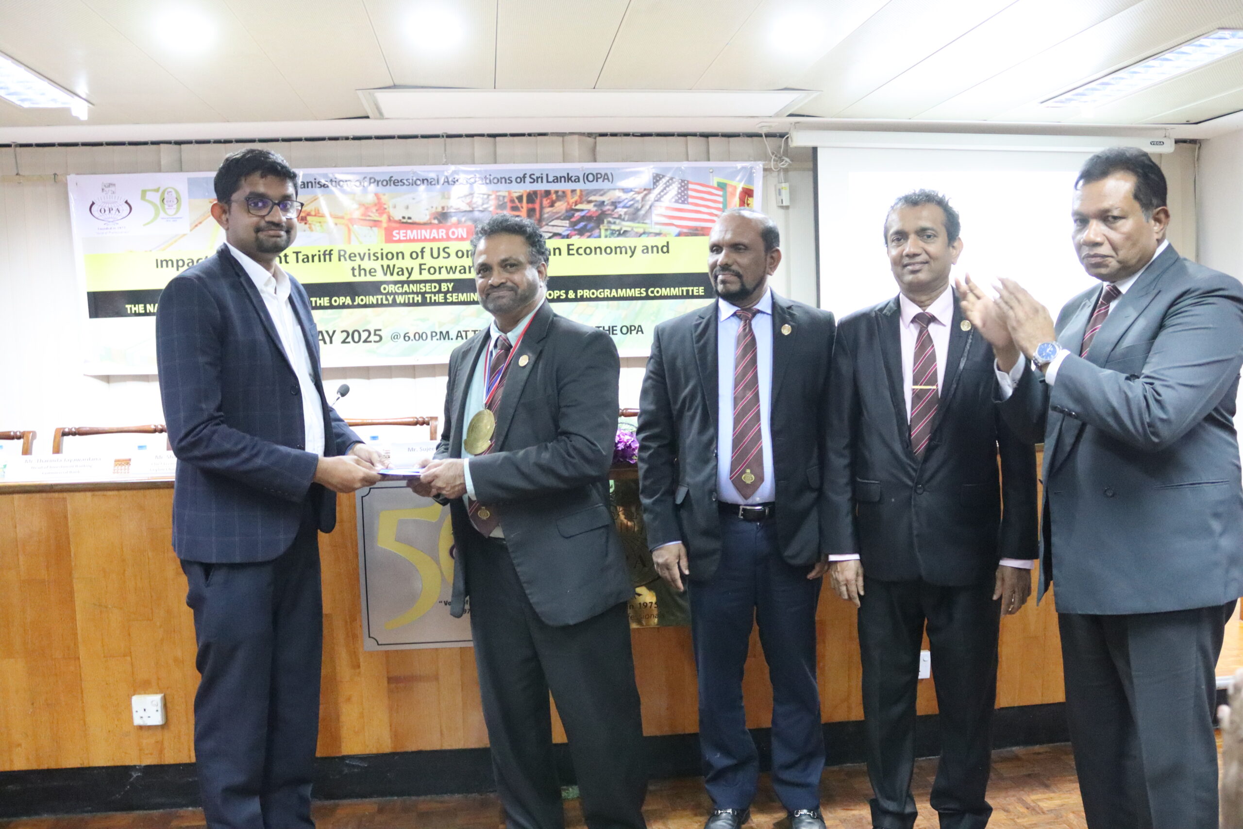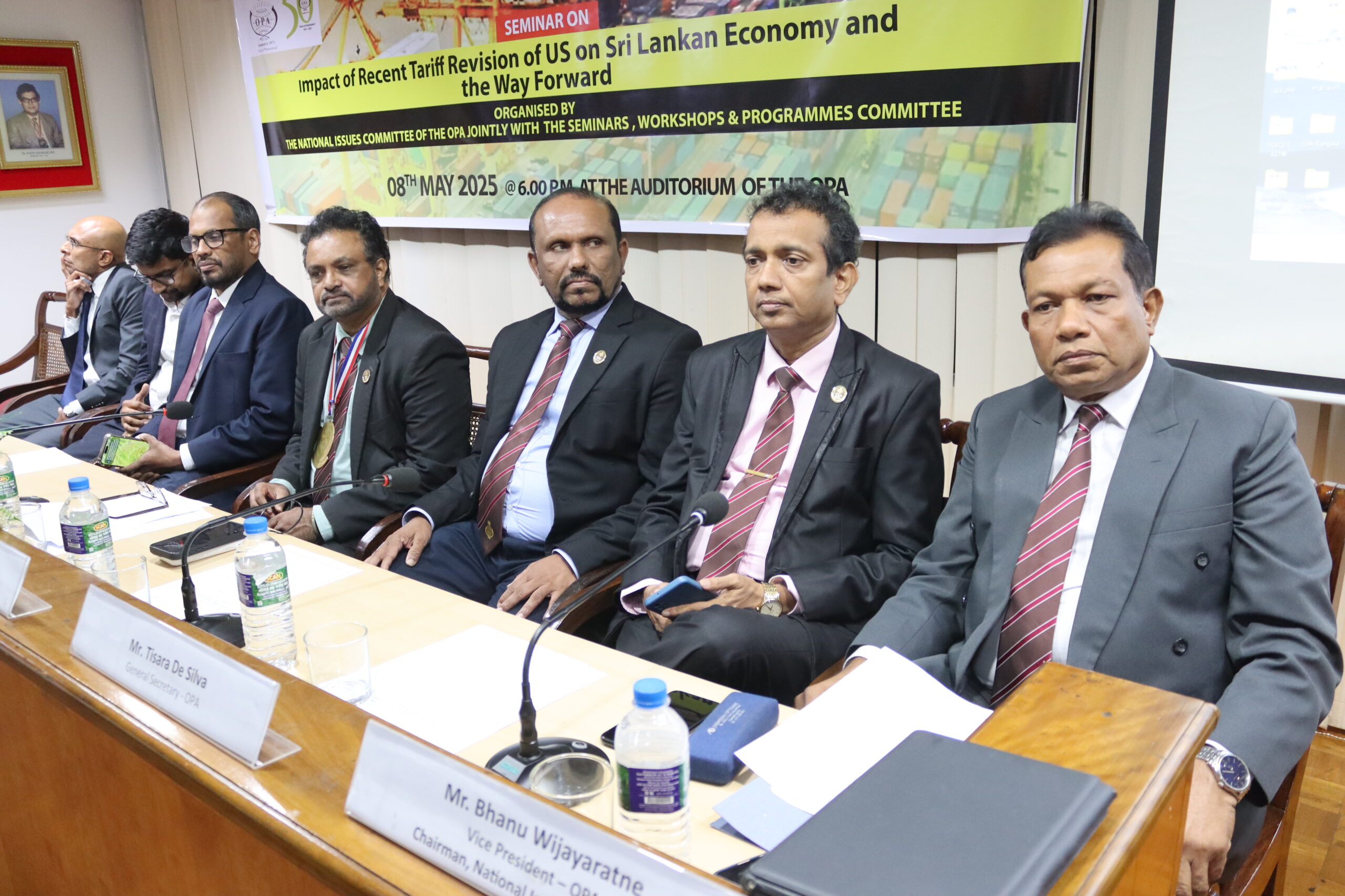 A seminar was conducted on “Impact of Recent Tariff Revision of US on Sri Lankan Economy and the Way Forward” on the 8th of May at the OPA. Organized jointly by the National Issues Committee and the Seminars, Workshops and Programmes Committee of the OPA, the event featured Mr. Shiran Fernando, Chief Economic Policy Advisor, Ceylon Chamber of Commerce, Mr. Tharinda Jayawardana, Head of Investment Banking, Commercial Bank and Mr. Mangala Wijesinghe, Chairman, Export Development Board, as expert guest speakers while the moderator was Mr. Bhanu Wijayaratne, Vice President and Chairman – NIC.