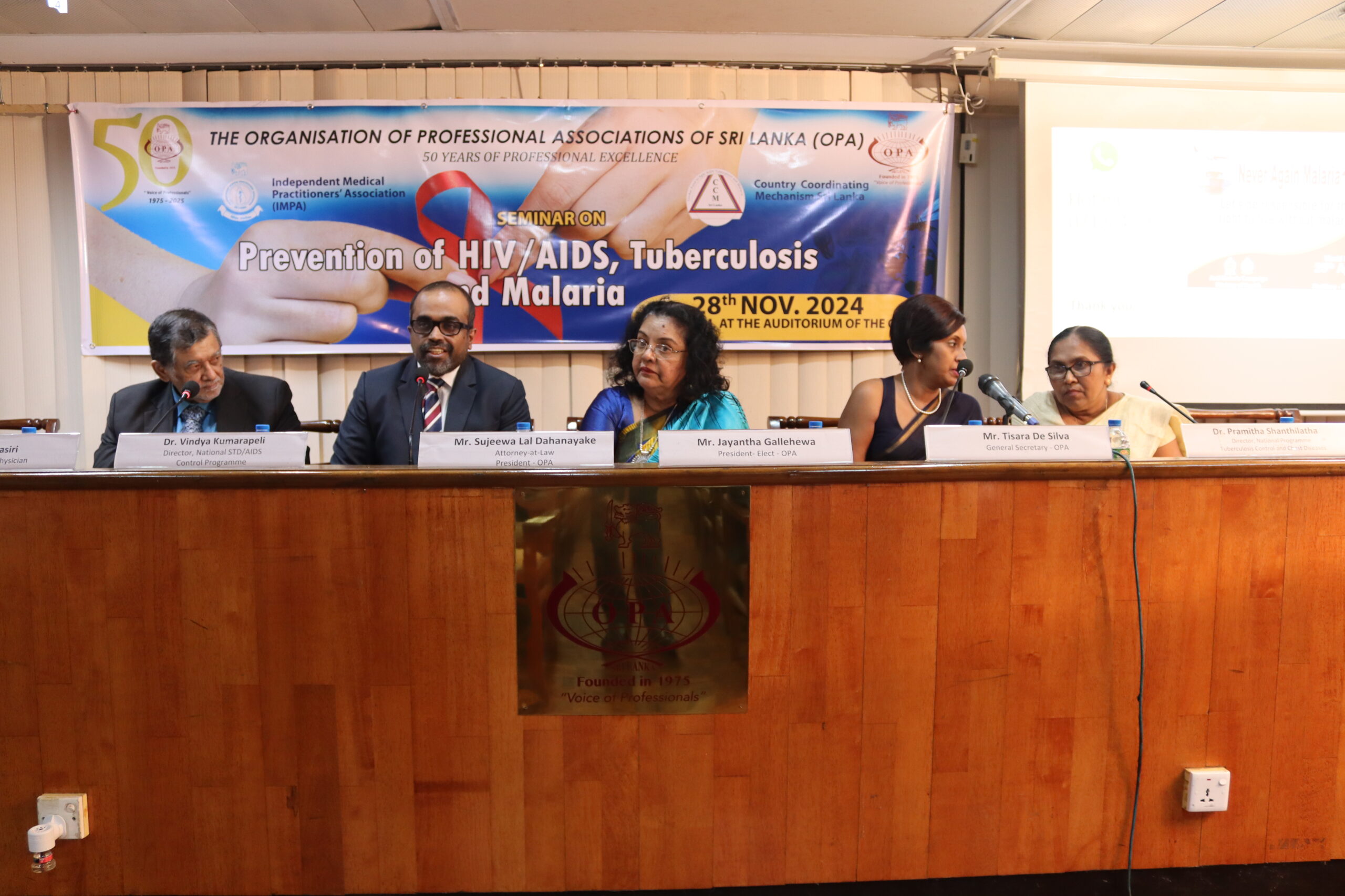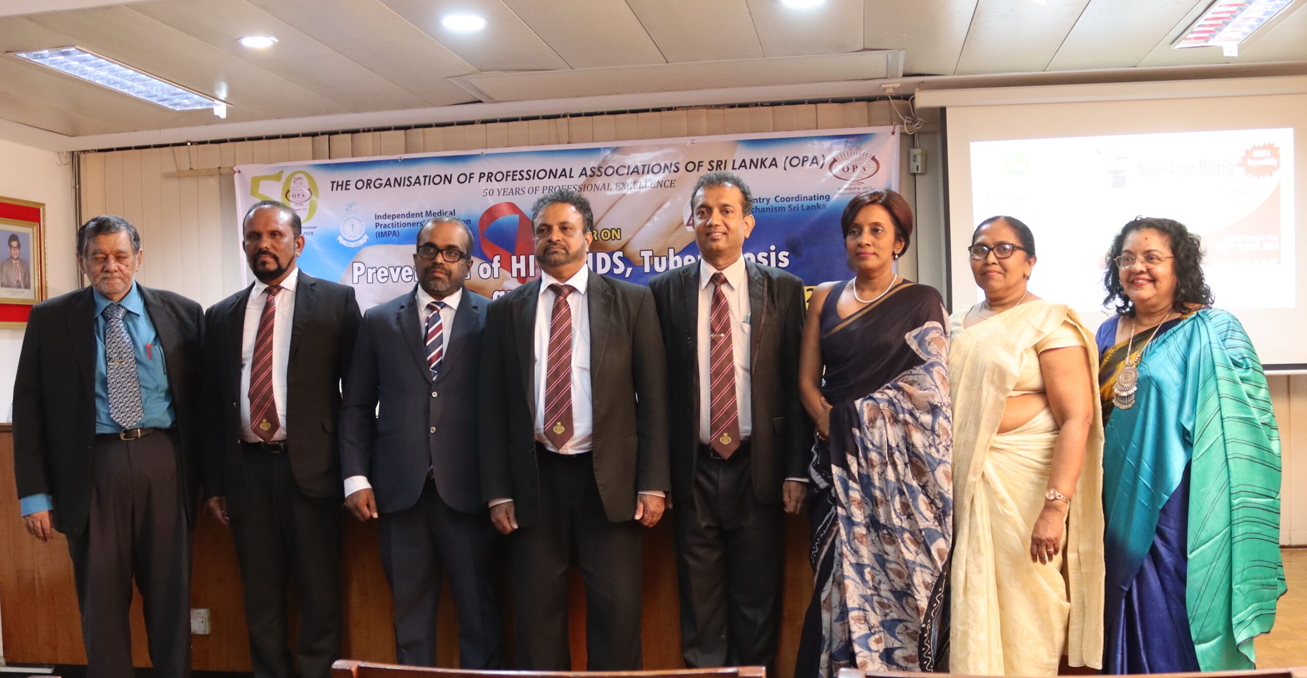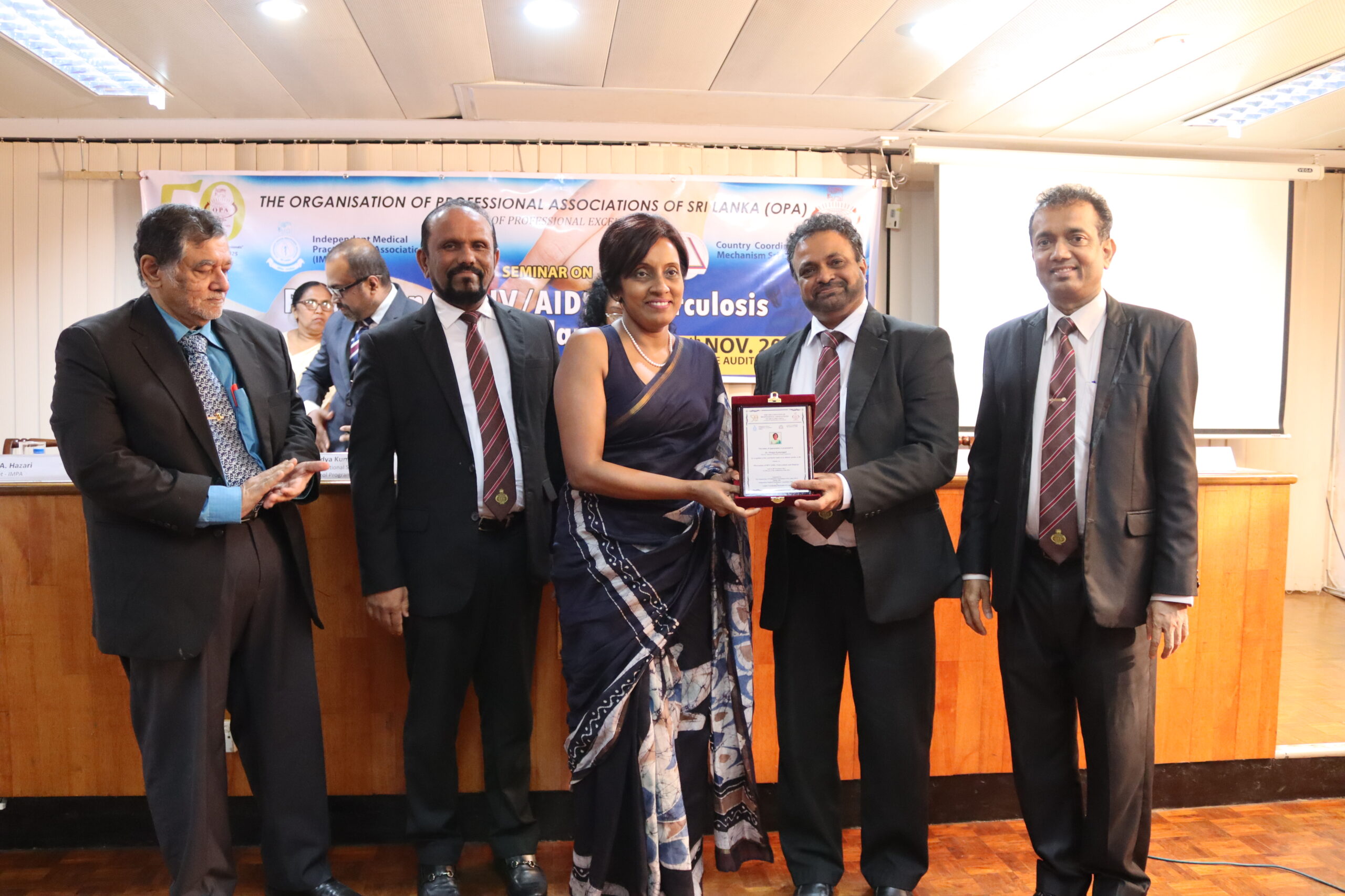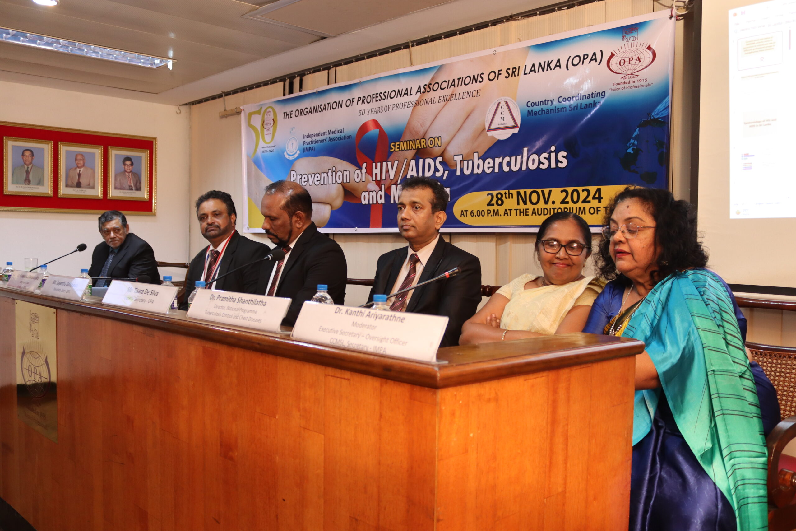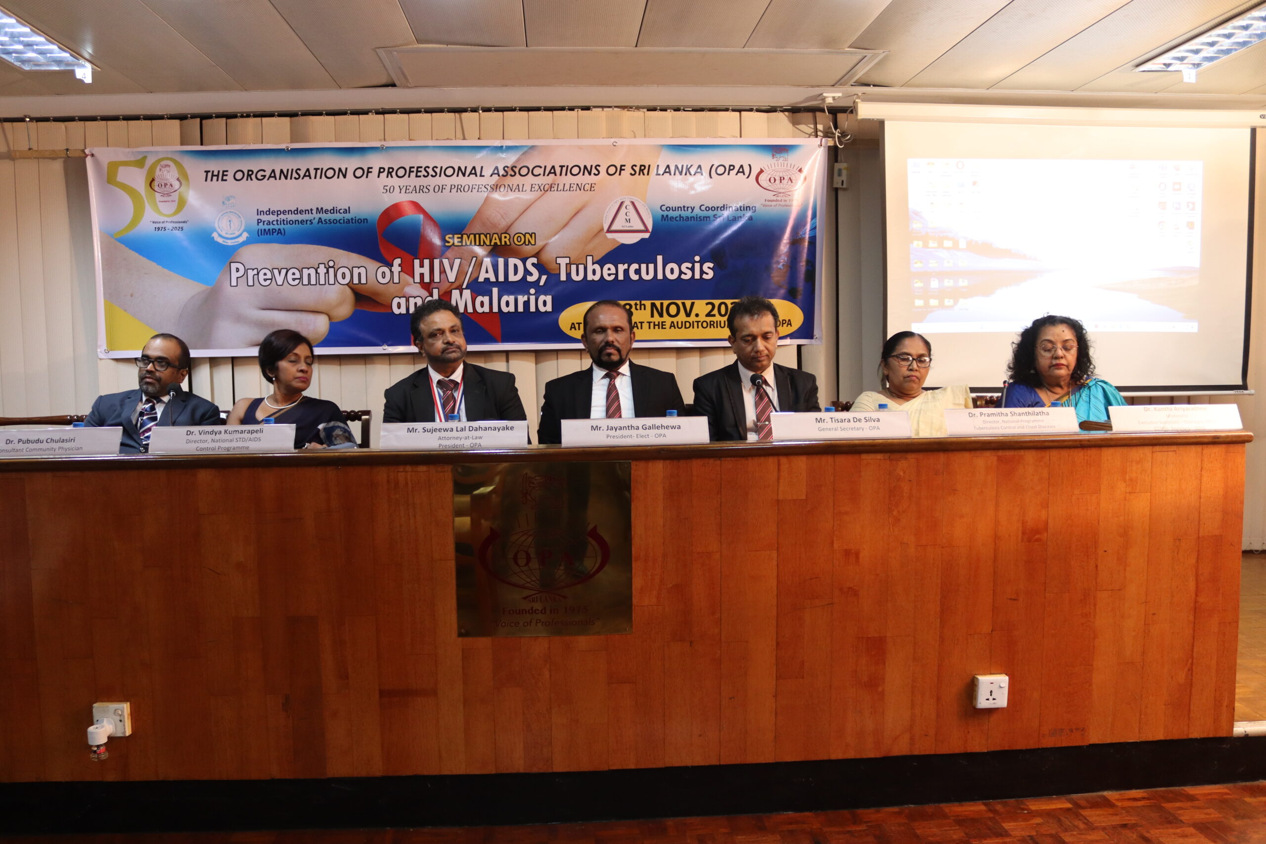A seminar was conducted on “The prevention of HIV/AIDS, Tuberculosis and Malaria” on the 28th of November at the OPA auditorium. It was jointly organized by the Organisation of Professional Associations of Sri Lanka and Independent Medical Practitioners’ Association, and sponsored by Country Coordinating Mechanism Sri Lanka. Dr. Vindya Kumarapeli, Director, National STD/AIDS Control Programme, Dr. Pramitha Shanthilatha, Director, National Programme Tuberculosis Control and Chest Diseases, and Dr. Pubudu Chulasiri, Consultant Community Physician, were the guest speakers at this event. The moderator was Dr. Kanthi Ariyaratne, Secretary, IMPA.