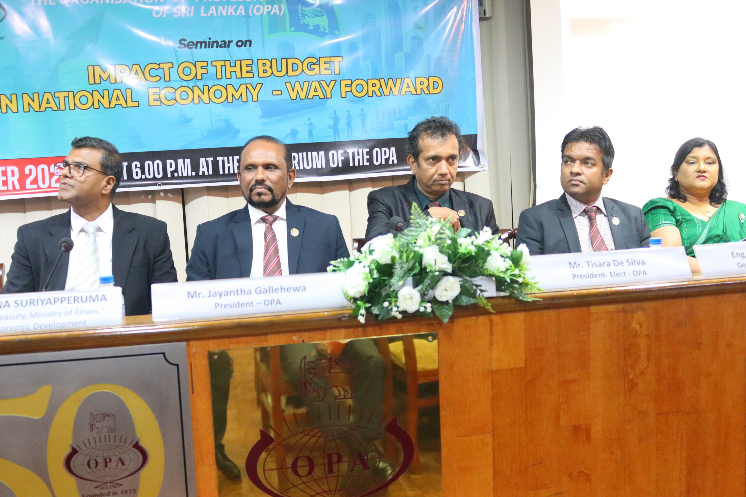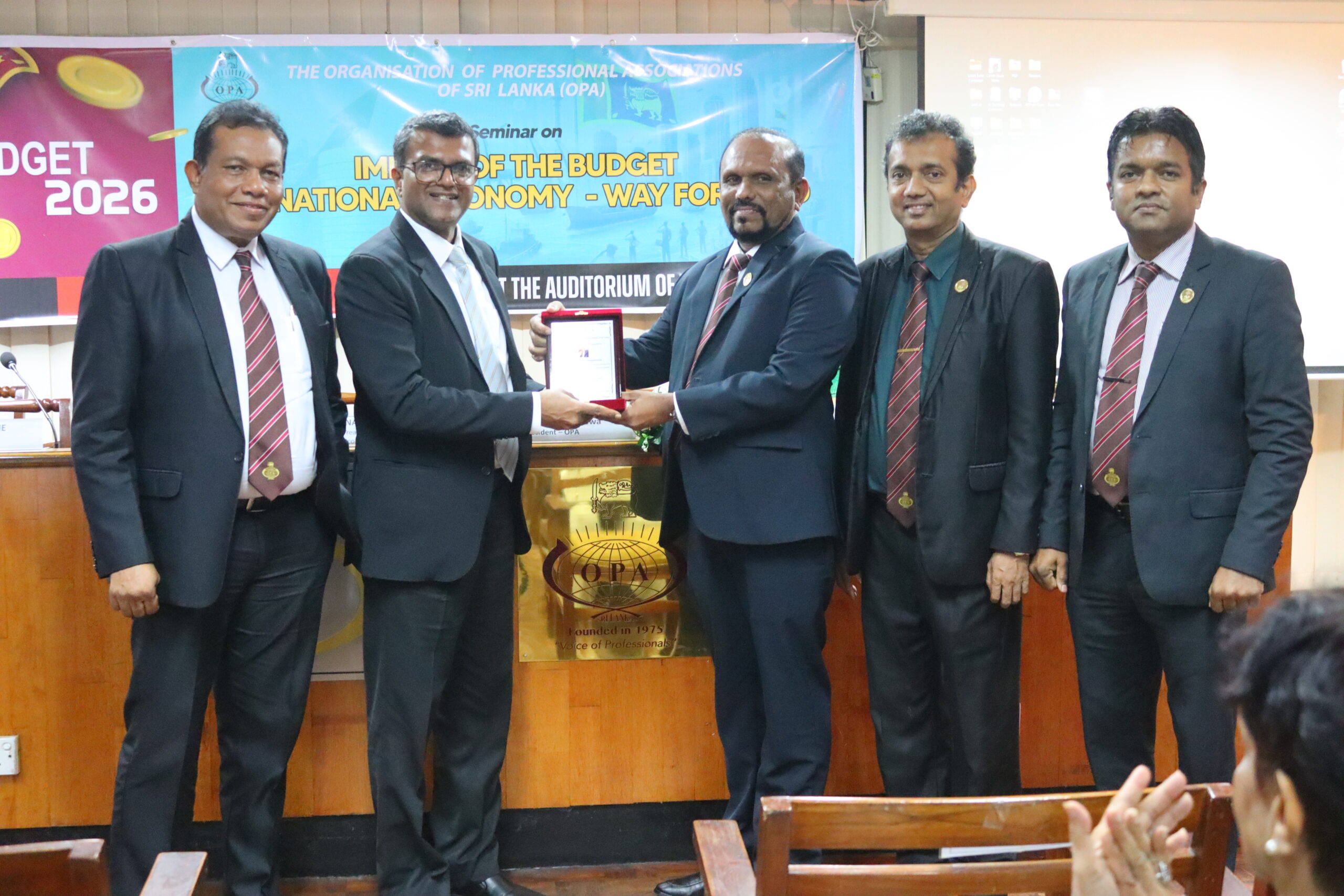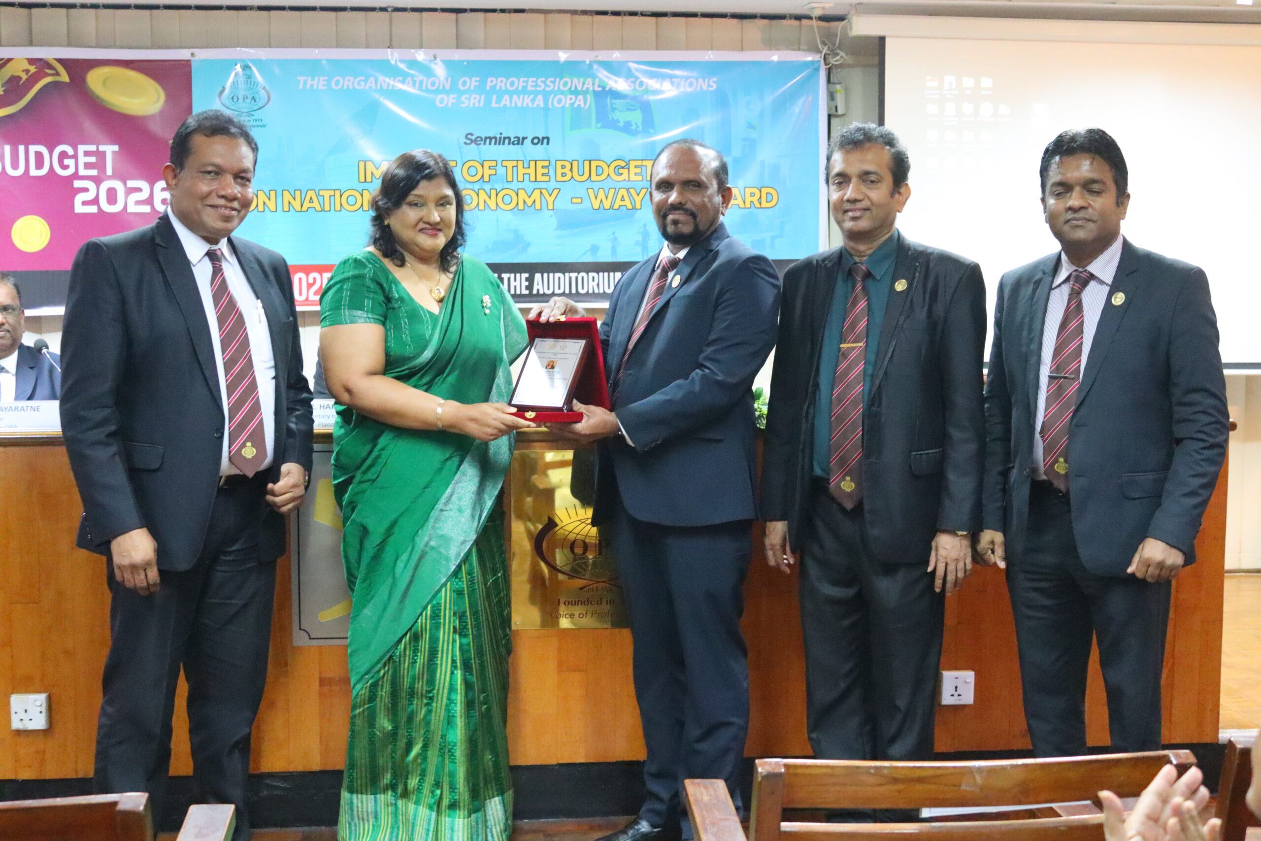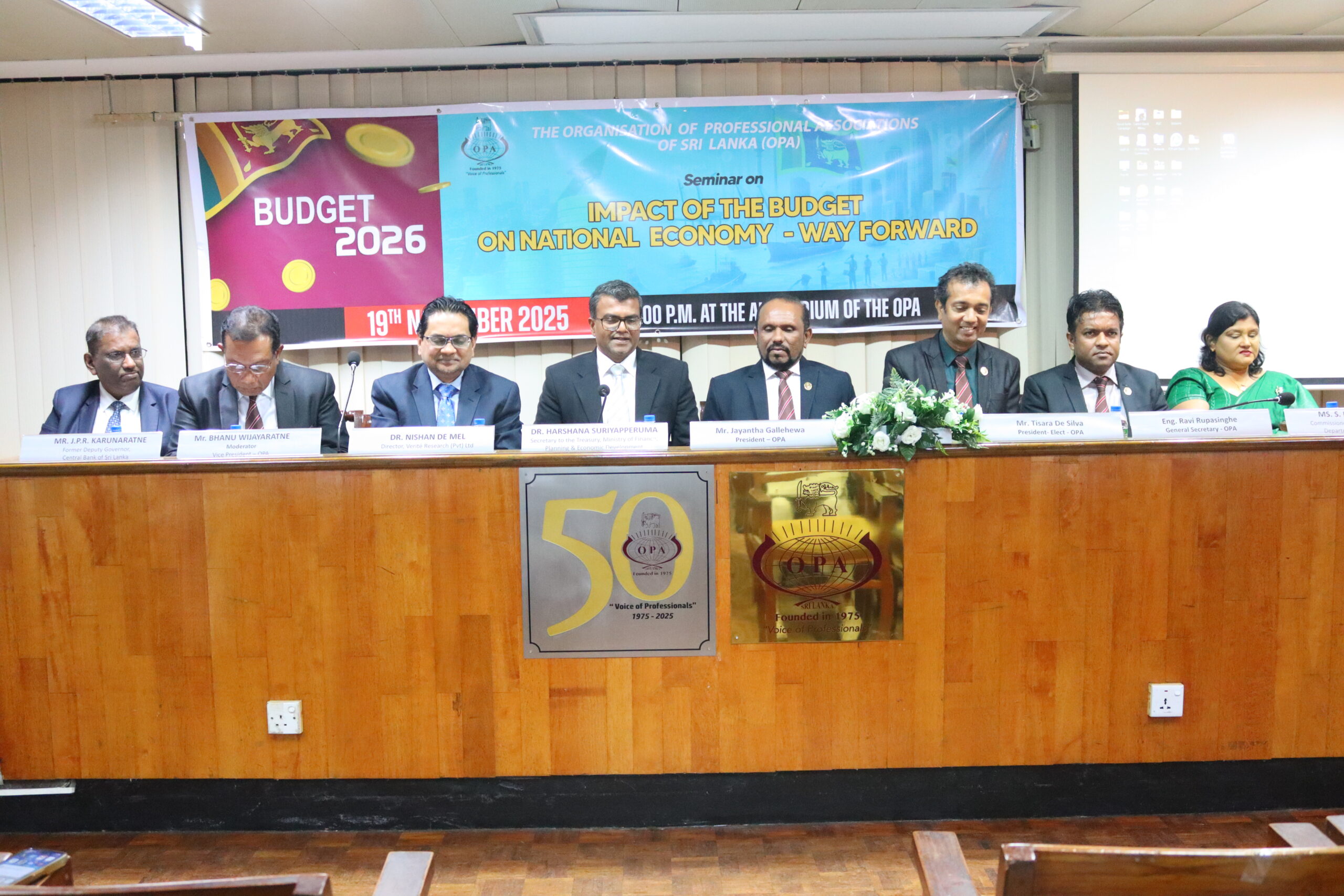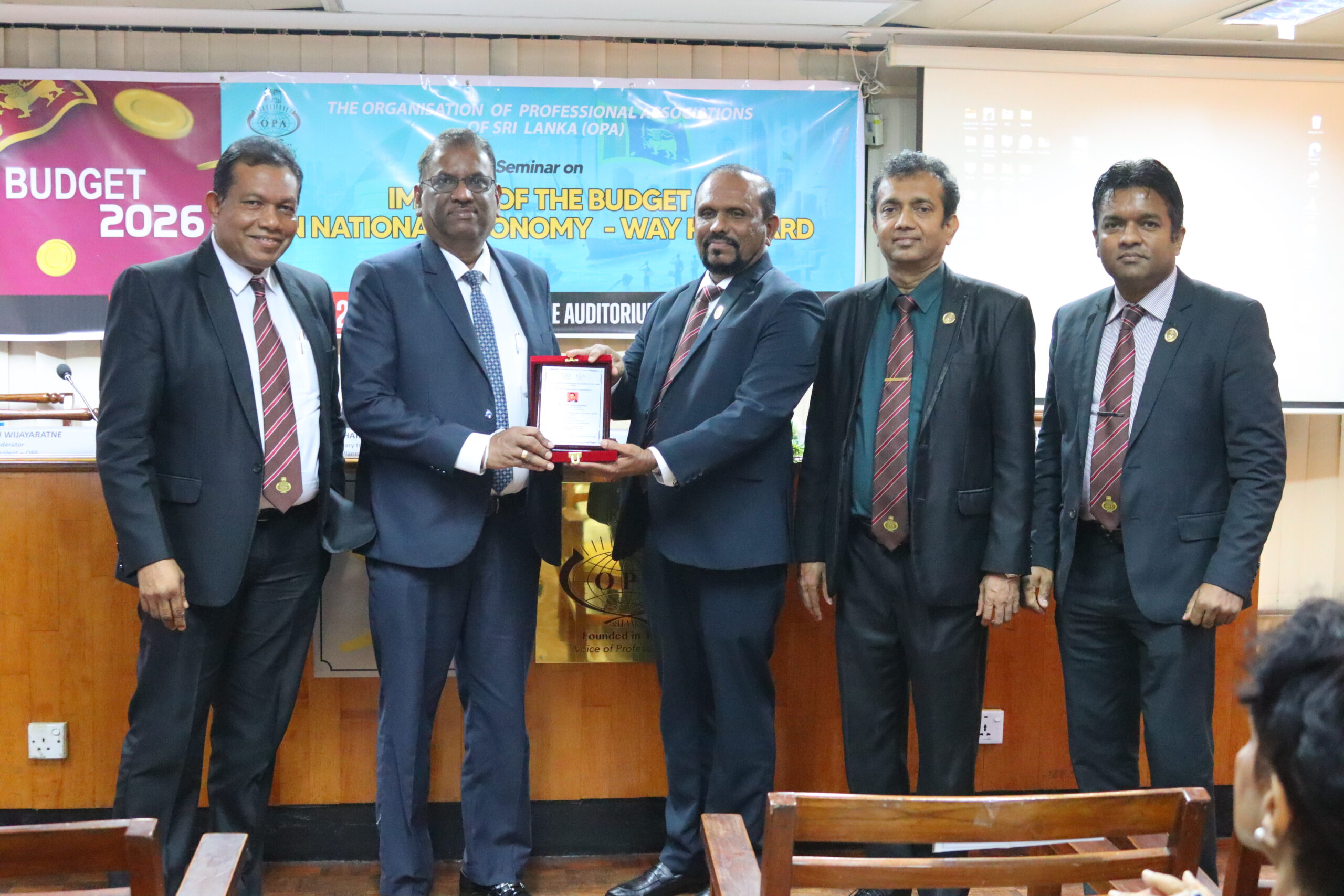 A seminar on “Impact of the Budget on the National Economy –Way Forward” was conducted by the Organisation of Professional Associations of Sri Lanka on 19th November, 2025 at the OPA Auditorium. The Keynote Speaker was Dr. Harshana Suriyapperuma, Secretary to the Treasury and Secretary to the Ministry of Finance, Planning and Economic Development while the panel of expert guest speakers consisted of Mr. J. P. R. Karunaratne, former Deputy Governor of the Central Bank of Sri Lanka; Ms. S. Iyesha Asanthi, Commissioner of Tax Policy and Legislation at the Department of Inland Revenue; and Dr. Nishan De Mel, Director of Verité Research.