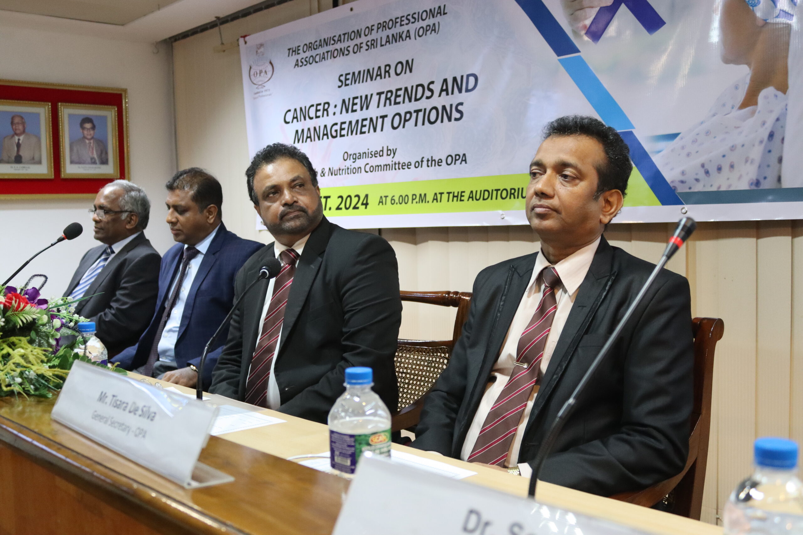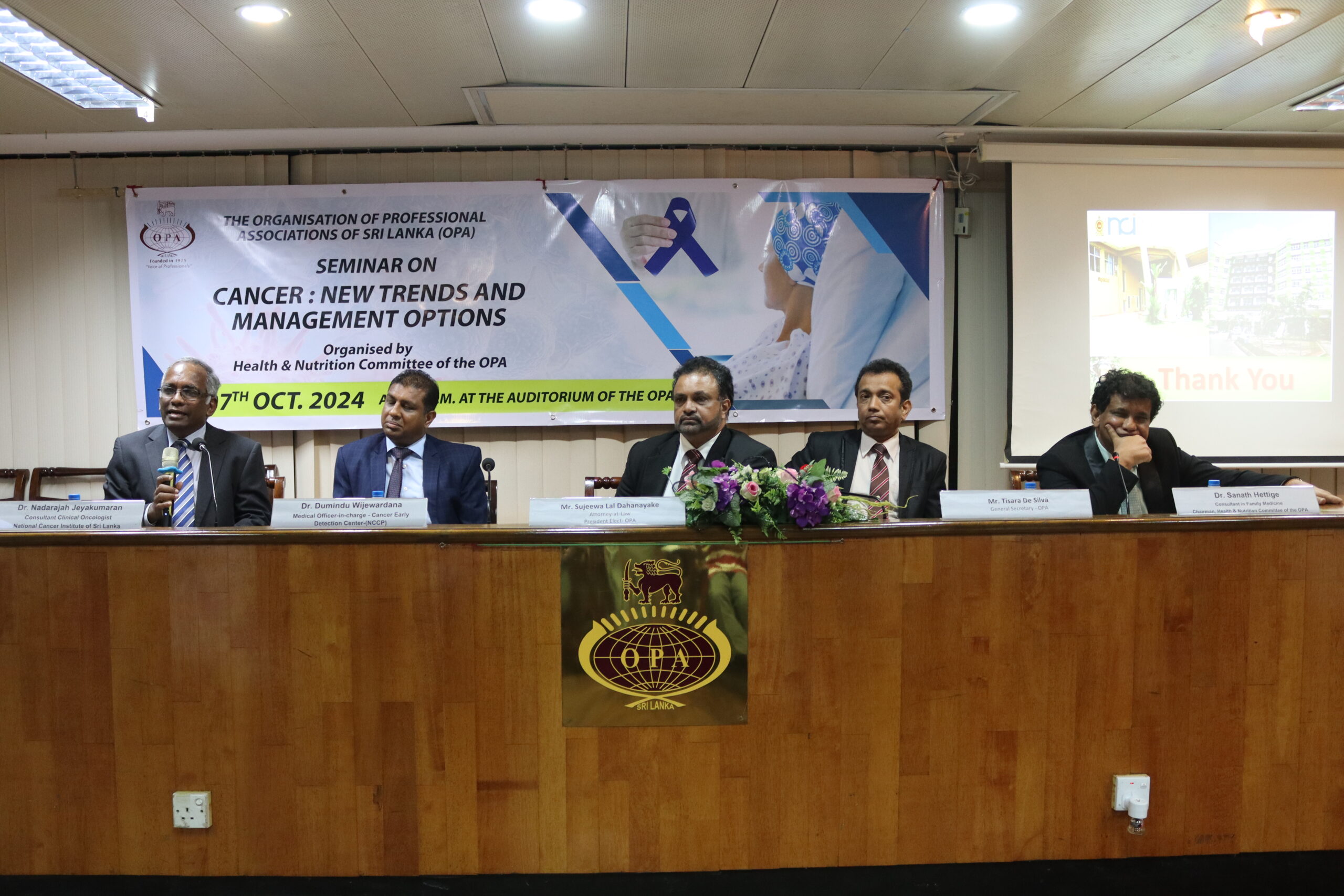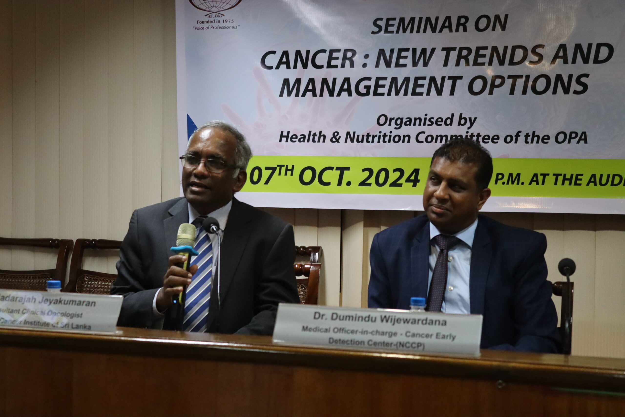 A seminar on “Cancer: New Trends and Management Options” was organized by the Health and Nutrition committee on the 7th of October, 2024. Dr. Nadarajah Jeyakumaran, Consultant Clinical Oncologist, National Cancer Institute of Sri Lanka and Dr. Dumindu Wijewardana, Medical Officer-in-charge, Cancer Early Detection Center were the guest speakers. The moderator was Dr. Sanath Hettige, Consultant in Family Medicine and the Chairman, Health and Nutrition Committee of the OPA. The speakers highlighted the importance of seeking prompt treatment for cancer as well the lifestyle changes that could reduce the risk of developing this disease. The latest treatments that are improving the prognosis of cancer were also described.
